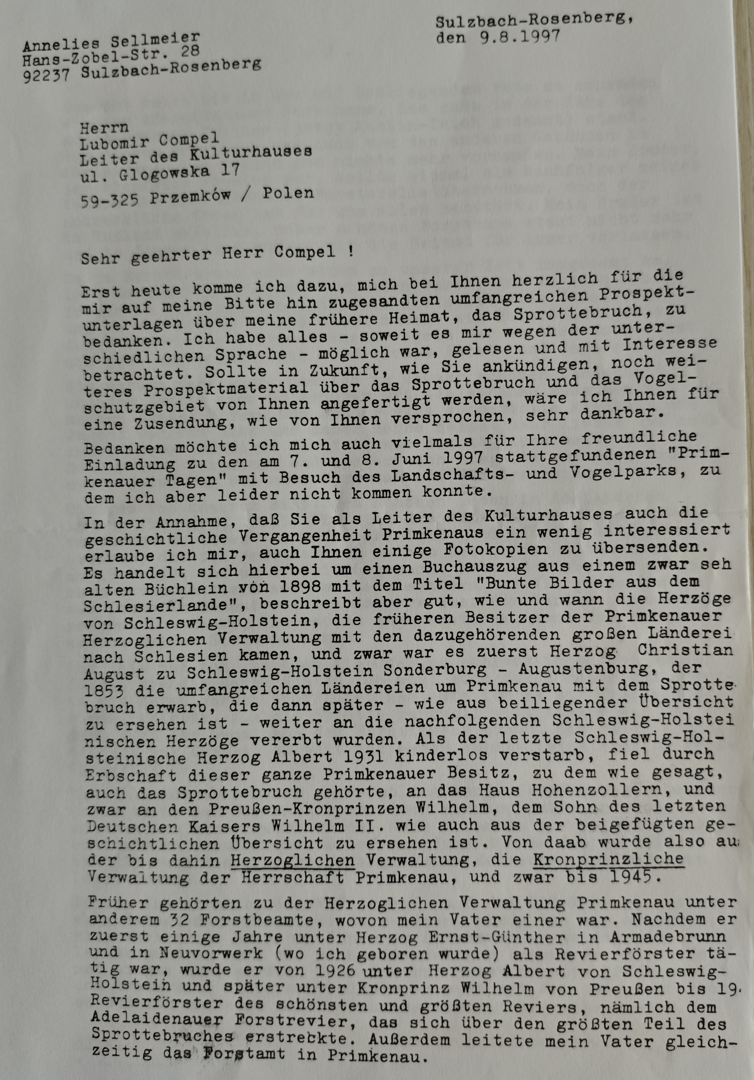 Zakładając, że jako dyrektor Domu Kultury interesuje się Pan nieco historią Przemkowa, pozwalam sobie przesłać Panu również kilka kserokopii. Jest to fragment starej książeczki z 1898 roku zatytułowanej „Kolorowe obrazki ze Śląska” (Bunte Bilder aus dem Schlesierlande), która dobrze opisuje, jak i kiedy książęta Szlezwiku-Holsztynu stali się właścicielami Przemkowskiego Zarządu Książęcego wraz z przynależnymi do niego wielkimi dobrami ziemskimi na Śląsku. Mianowicie, to najpierw książę Christian August ze Szlezwiku-Holsztynu-Sonderburga-Augustenburga nabył w 1853 roku rozległe dobra wokół Przemkowa wraz z Bagnami Przemkowskimi (Sprottebruch), które następnie – jak widać z załączonego zestawienia – były dziedziczone przez kolejnych książąt szlezwicko-holsztyńskich. Kiedy ostatni książę Szlezwiku-Holsztynu Albert zmarł bezdzietnie w 1931 roku, cały ten majątek przemkowski, do którego – jak wspomniano – należały też Bagna Przemkowskie, w drodze spadku przeszedł na Dom Hohenzollernów, a konkretnie na pruskiego następcę tronu (Kronprinz) Wilhelma, syna ostatniego cesarza niemieckiego Wilhelma II (co również widać w załączonym zestawieniu historycznym). Od tego momentu, aż do roku 1945, dawny Zarząd Książęcy nosił nazwę Zarządu Następcy Tronu Dobra Przemków (Kronprinzliche Verwaltung der Herrschaft Primkenau).