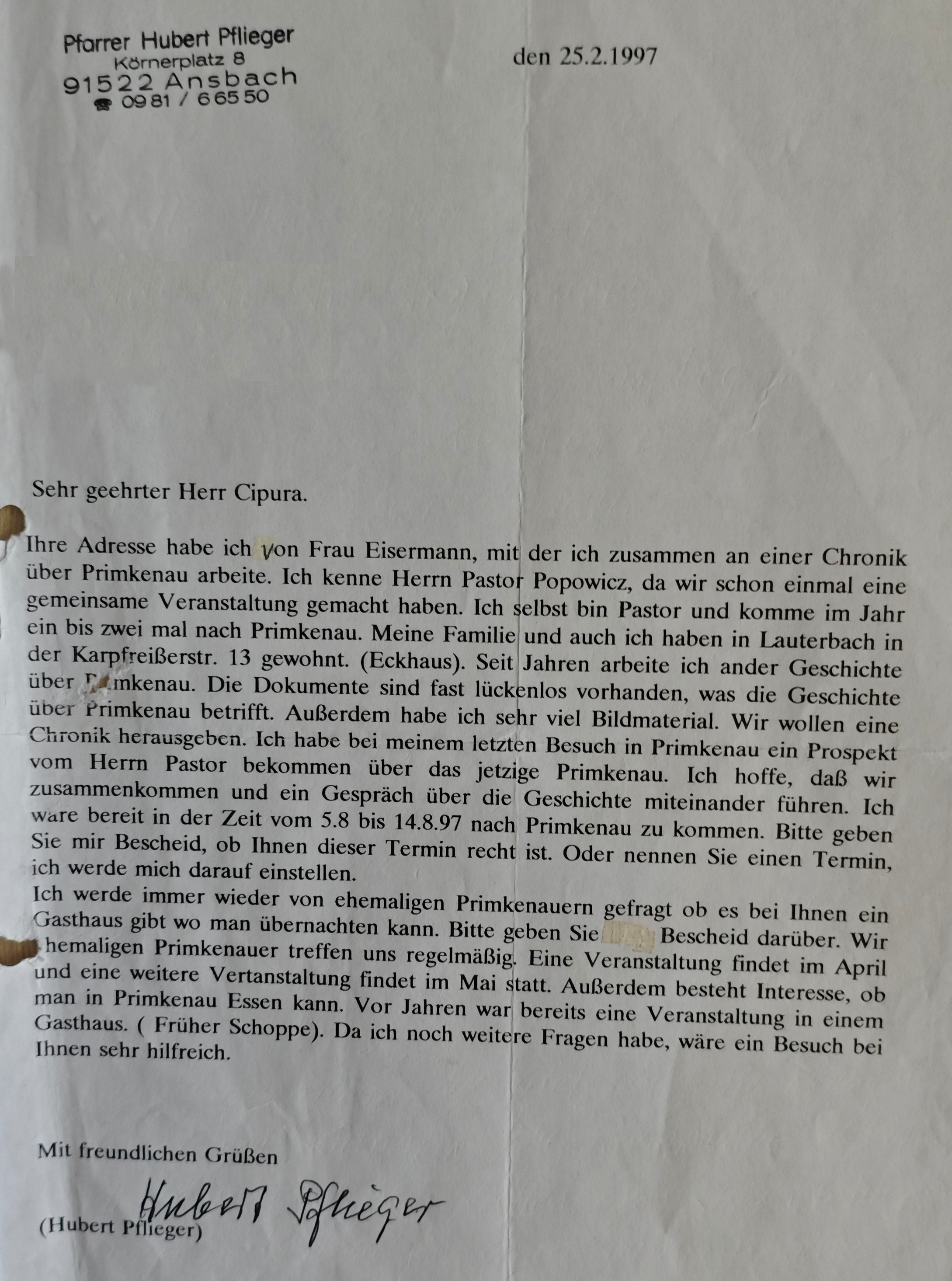 Pański adres otrzymałem od Pani Eisermann, z którą wspólnie pracuję nad kroniką Przemkowa. Znam Pastora Popowicza, ponieważ już raz nawiązaliśmy wspólne działania. Sam jestem pastorem i przyjeżdżam do Przemkowa raz lub dwa razy w roku. Moja rodzina i ja mieszkaliśmy też w Lauterbach (obecnieieniawice/Mokre?). Od lat pracuję nad inną historią dotyczącą Przemkowa. Dokumenty są prawie kompletne, co dotyczy historii Przemkowa. Ponadto posiadam bardzo dużo materiałów zdjęciowych. Chcemy wydać kronikę. Otrzymałem od Pana Pastora ostatnią wizytę w Przemkowie prospekt. Mam nadzieję, że się spotkamy i przeprowadzimy rozmowę o historii Przemkowa. Byłbym gotów przyjechać do Przemkowa w terminie od 5 do 14 sierpnia 1997 r. Proszę dać mi znać, czy ten termin Panu pasuje. Lub proszę podać inny termin, ja się do tego dostosuję.