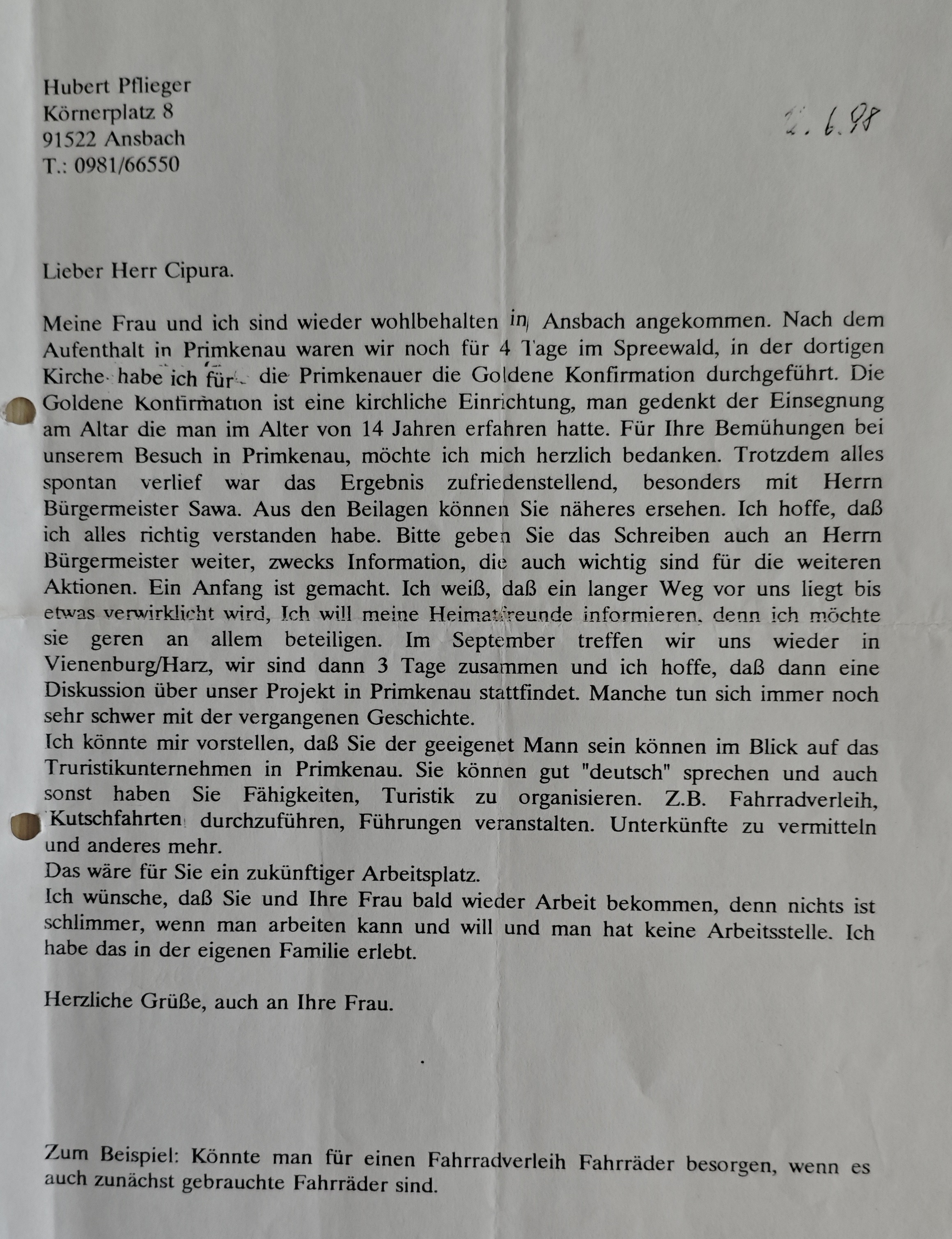 Chciałbym serdecznie podziękować za Pana starania podczas naszej wizyty w Przemkowie. Mimo że wszystko przebiegło spontanicznie, wynik był zadowalający, zwłaszcza [rozmowy] z Panem Burmistrzem Sawą. Z załączników może Pan dowiedzieć się więcej. Mam nadzieję, że wszystko dobrze zrozumiałem. Proszę przekazać to pismo również Panu Burmistrzowi, celem informacji, co jest ważne dla dalszych działań.