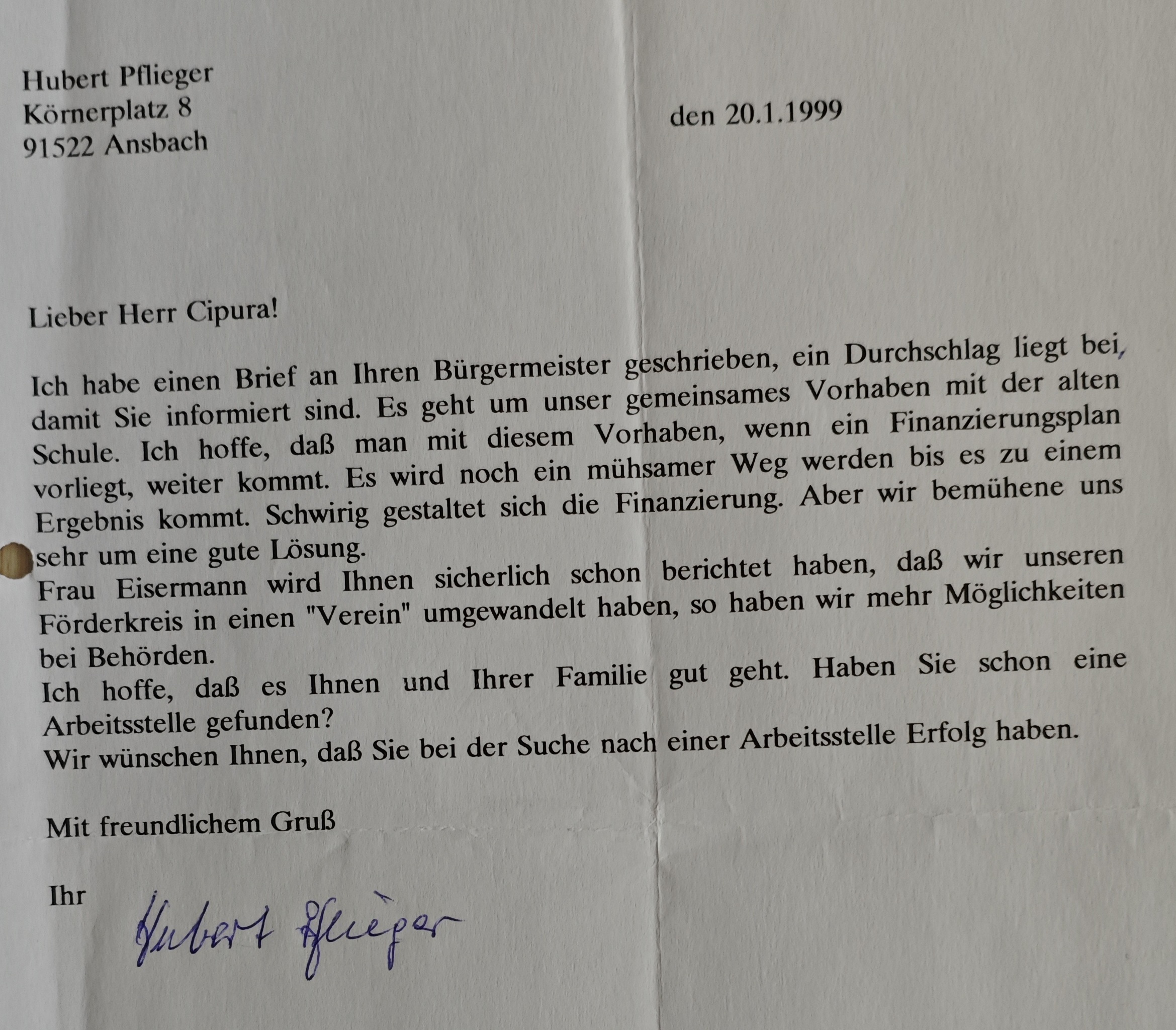 Napisałem list do Pańskiego burmistrza, załączam kopię, aby był Pan poinformowany. Chodzi o nasze wspólne przedsięwzięcie dotyczące starej szkoły. Mam nadzieję, że gdy pojawi się plan finansowania, ruszymy z tym przedsięwzięciem do przodu. Będzie to jeszcze mozolna droga, zanim osiągniemy rezultat. Kwestia finansowania zapowiada się trudno. Ale bardzo staramy się o dobre rozwiązanie.