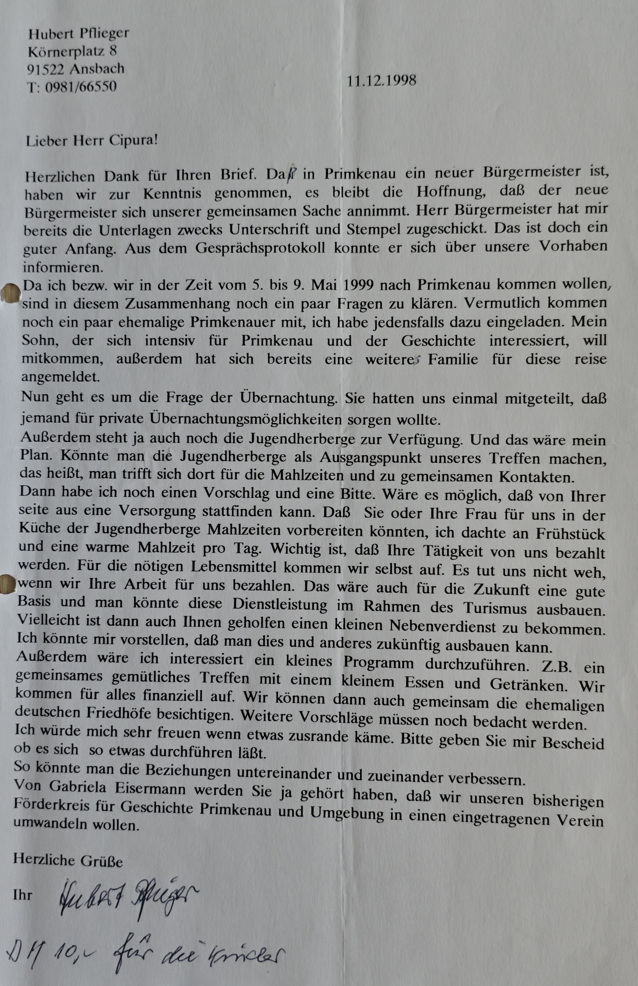 Ponieważ ja, a właściwie my, chcemy przyjechać do Przemkowa w terminie od 5 do 9 maja 1999 r., w związku z tym trzeba wyjaśnić jeszcze kilka kwestii. Prawdopodobnie przyjedzie z nami jeszcze kilku dawnych mieszkańców Przemkowa, w każdym razie wystosowałem zaproszenia. Mój syn, który intensywnie interesuje się Przemkowem i historią, przyjedzie z nami, ponadto na tę podróż zgłosiła się już kolejna rodzina.