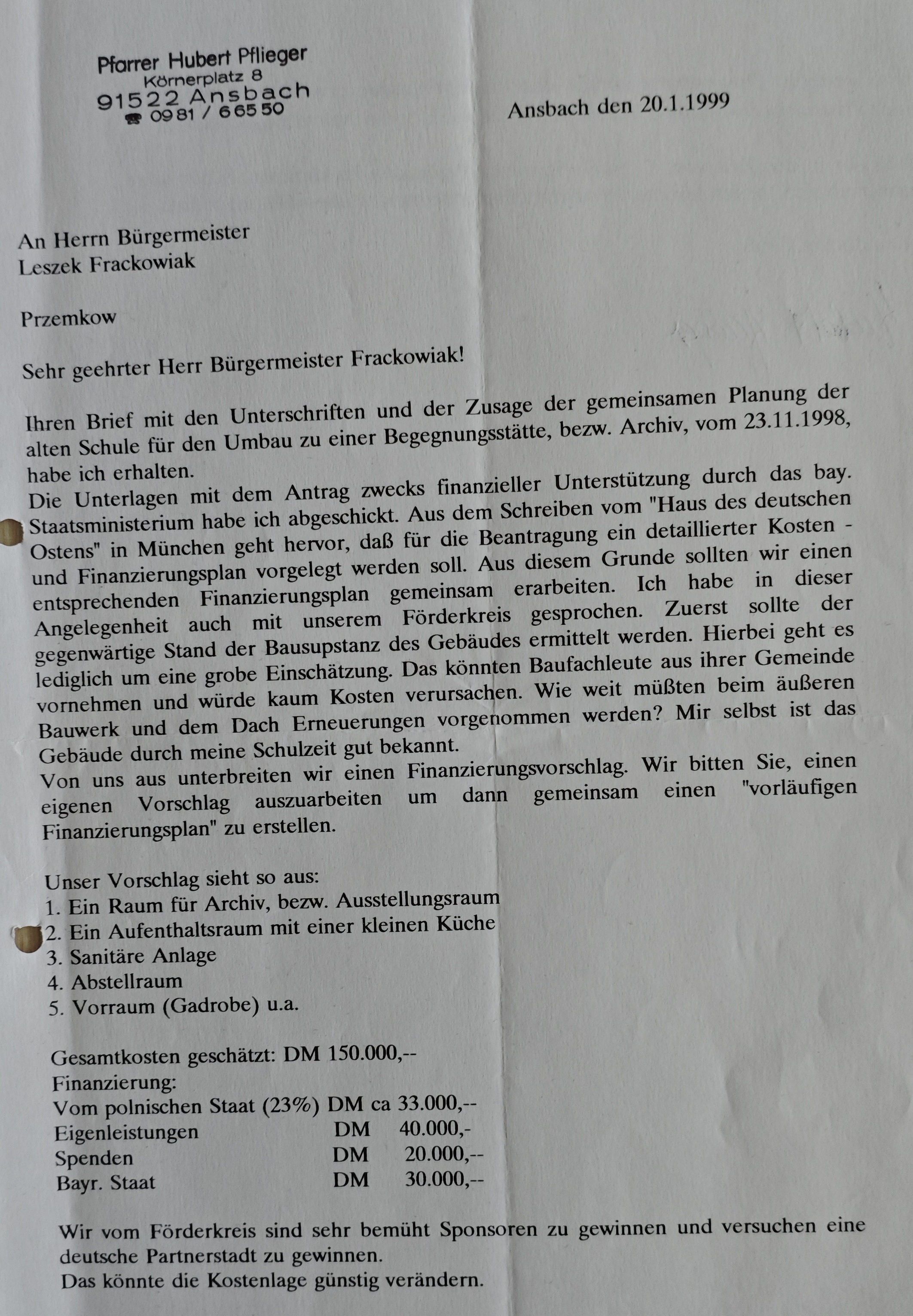 Wysłałem dokumenty z wnioskiem o wsparcie finansowe do Bawarskiego Ministerstwa Państwowego. Z pisma z "Domu Niemieckiego Wschodu" w Monachium wynika, że do wniosku należy przedłożyć szczegółowy plan kosztów i finansowania. Z tego powodu powinniśmy wspólnie opracować odpowiedni plan finansowy. Rozmawiałem w tej sprawie również z naszym kołem wsparcia (Förderkreis). Najpierw należy ustalić obecny stan techniczny budynku (substancji budowlanej). Chodzi tu jedynie o zgrubną ocenę. Mogliby to wykonać fachowcy budowlani z Państwa gminy i nie spowodowałoby to prawie żadnych kosztów. W jakim zakresie konieczne byłyby renowacje bryły budynku z zewnątrz oraz dachu? Mi samemu budynek ten jest dobrze znany z czasów szkolnych.