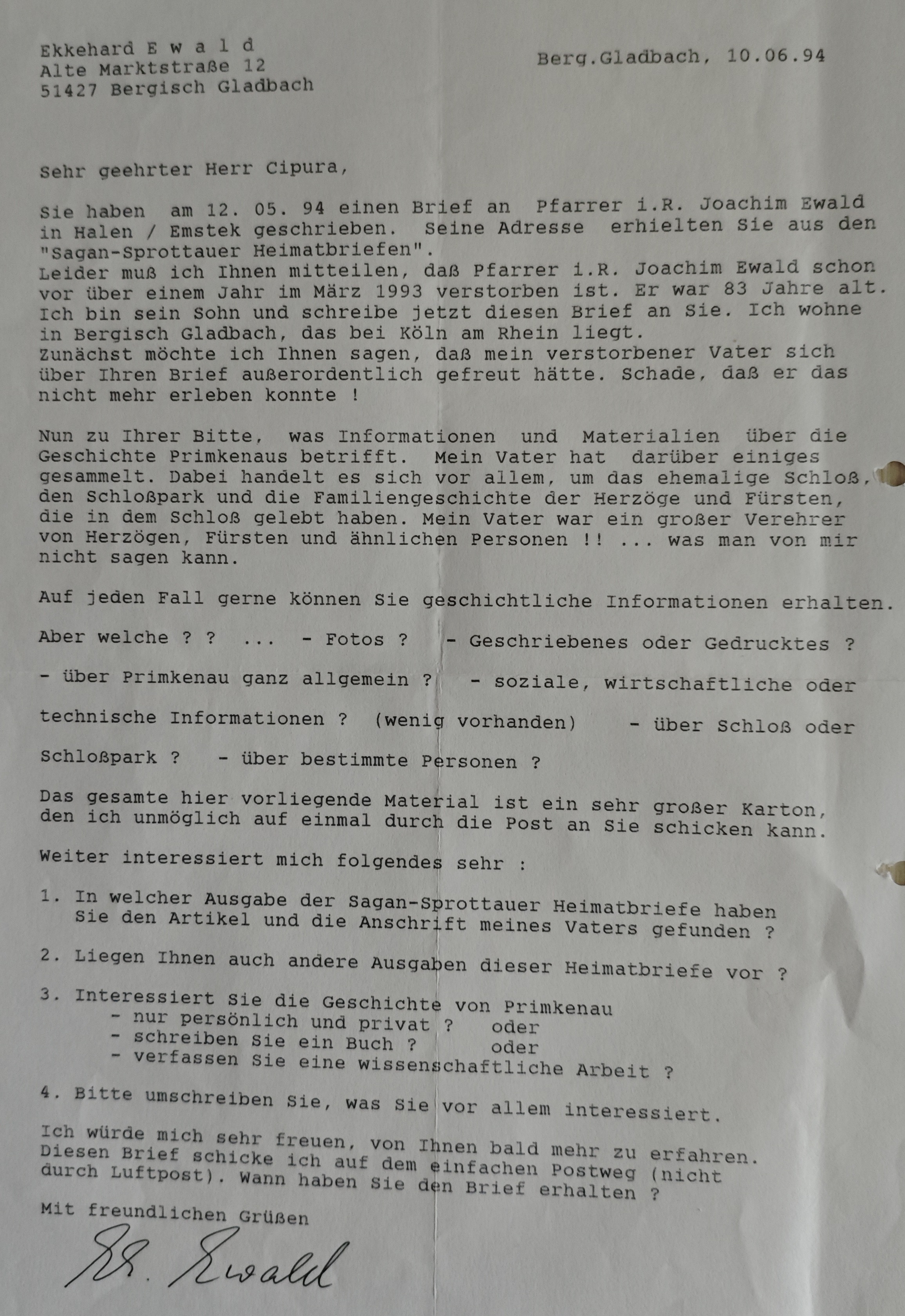 W dniu 12.05.94 napisał Pan list do pastora w stanie spoczynku Joachima Ewalda w Halen / Emstek. Jego adres otrzymał Pan z biuletynów "Sagan-Sprottauer Heimatbriefe".
