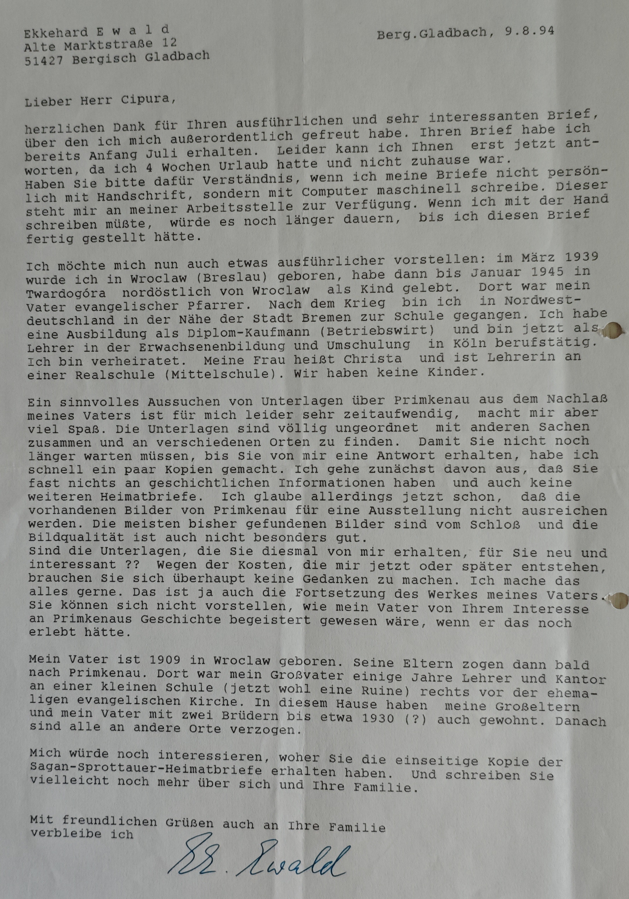 Chciałbym się teraz Panu nieco dokładniej przedstawić: w marcu 1939 roku urodziłem się we Wrocławiu (Breslau), a następnie do stycznia 1945 mieszkałem jako dziecko w Twardogórze na północny wschód od Wrocławia. Tam mój ojciec był pastorem ewangelickim. Po wojnie jestem w północno-zachodnich Niemczech w pobliżu miasta Brema, gdzie odbyłem edukację szkolną. Mam wykształcenie jako dyplomowany handlowiec (ekonomista przedsiębiorstwa) i jestem teraz czynny zawodowo jako nauczyciel w edukacji dorosłych i przekwalifikowaniu w Kolonii.