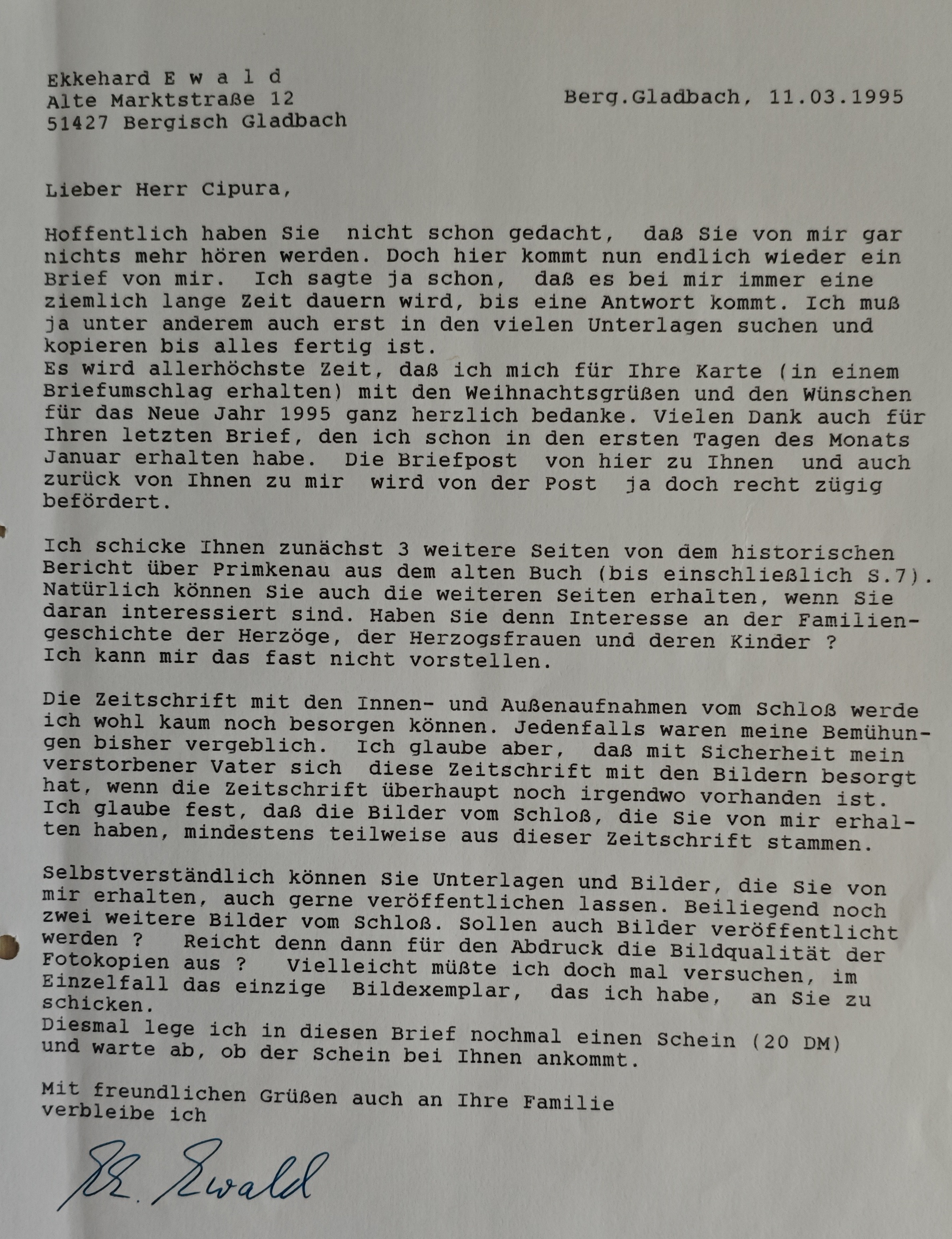 Oczywiście może Pan zatrzymać dokumenty i zdjęcia, które Pan ode mnie otrzymuje, a także chętnie je opublikować. W załączeniu jeszcze dwa kolejne zdjęcia zamku. Czy zdjęcia też mają zostać opublikowane? Czy jakość obrazu z fotokopii wystarczy wtedy do druku? Może musiałbym jednak spróbować w pojedynczym przypadku wysłać Panu jedyny egzemplarz zdjęcia (oryginał), jaki posiadam.