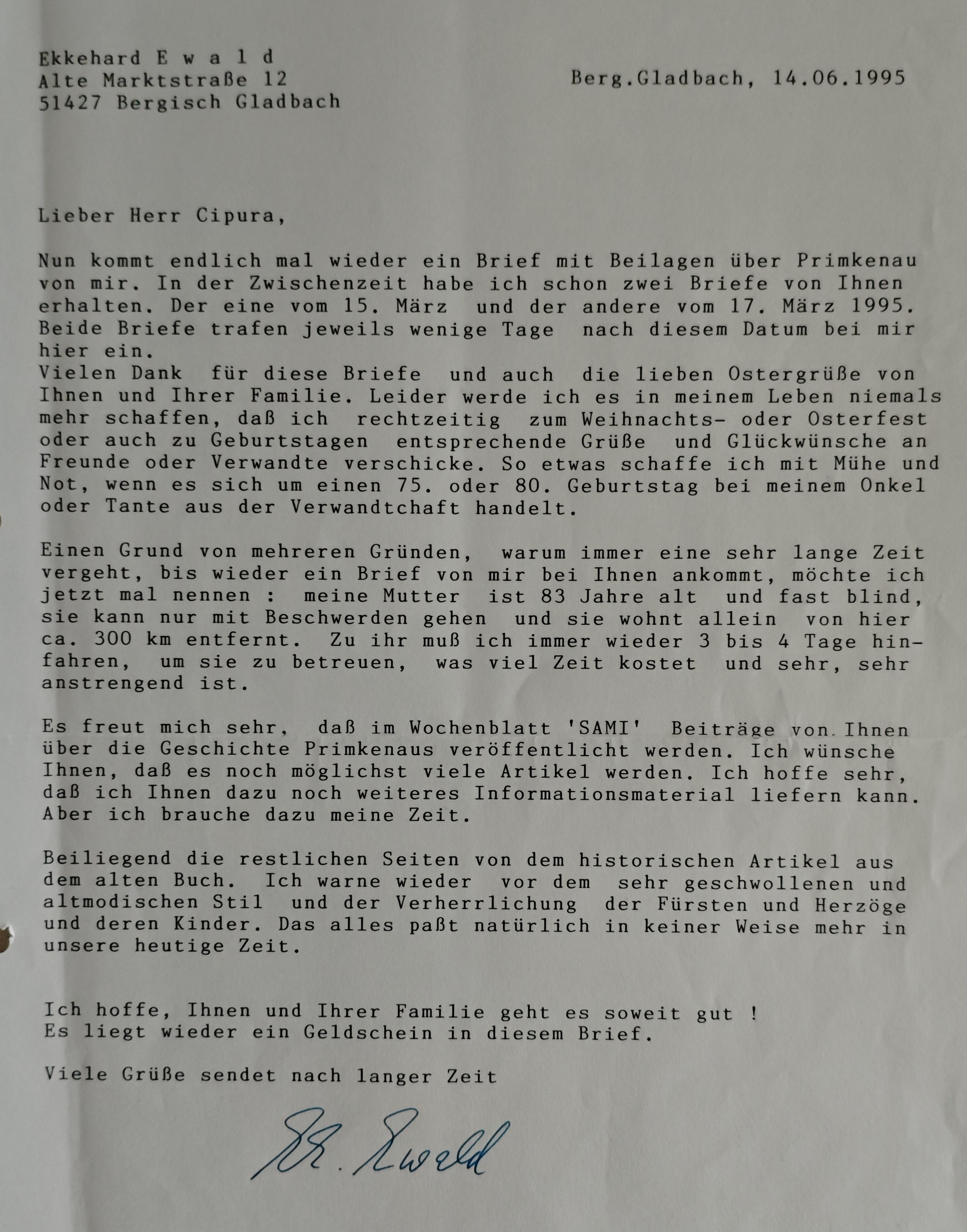 Bardzo mnie cieszy, że w tygodniku "SAMI" publikowane są przyczynki do historii Przemkowa. Życzę Panu, aby powstało jeszcze możliwie wiele artykułów. Mam wielką nadzieję, że będę mógł Panu dostarczyć jeszcze więcej materiałów informacyjnych. Ale potrzebuję na to czasu.