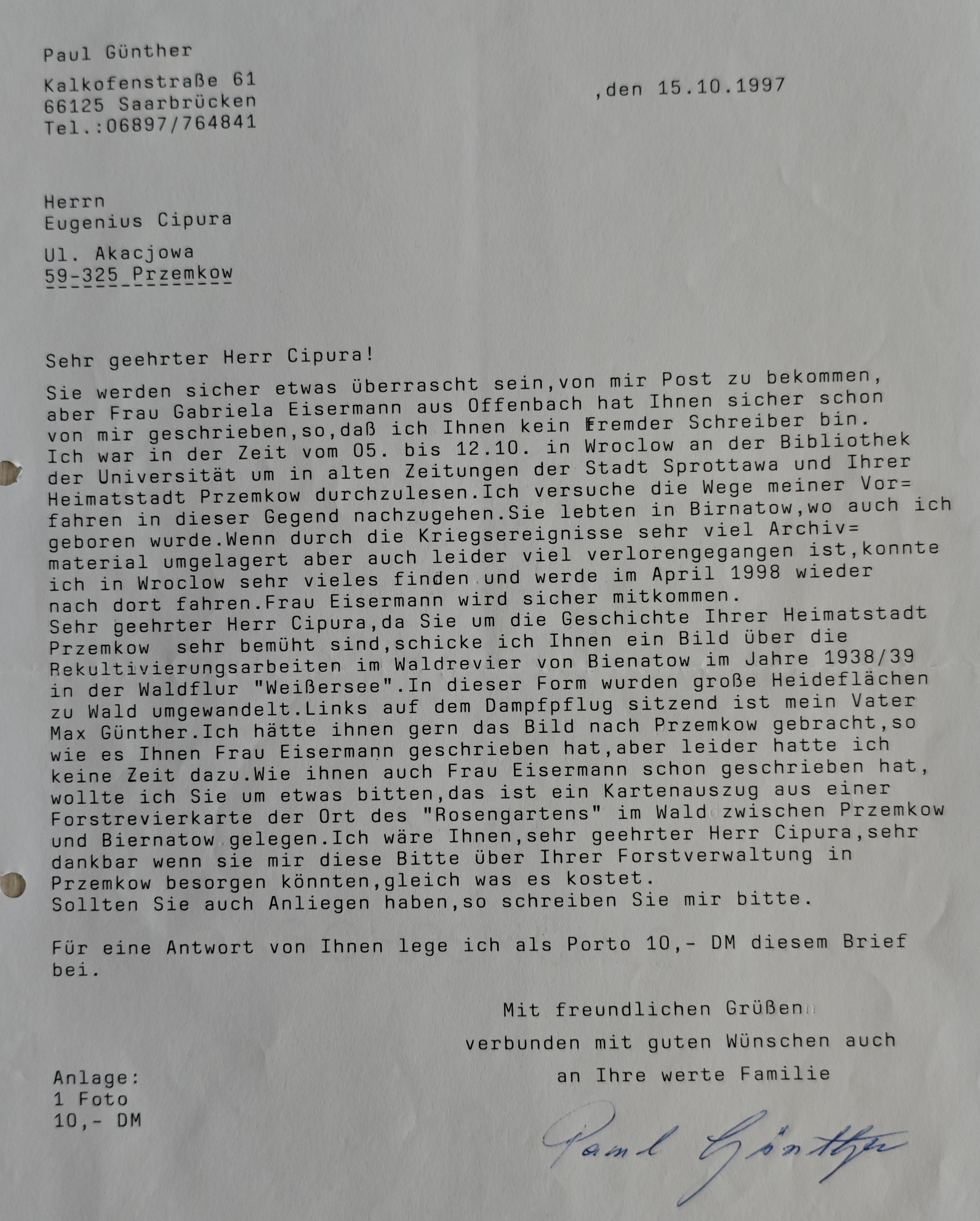 Szanowny Panie Cipura, ponieważ bardzo stara się Pan o historię swojego rodzinnego miasta Przemków, przesyłam Panu zdjęcie z prac rekultywacyjnych w rewirze leśnym Biernatów z lat 1938/39 na leśnej polanie "Weiβersee" (Białe Jezioro). W tej formie duże wrzosowiska zamieniano w las. Po lewej stronie, siedząc na pługu parowym, znajduje się mój ojciec Max Günther. Chętnie przywiózłbym Panu to zdjęcie do Przemkowa, tak jak pisała do Pana Pani Eisermann, ale niestety nie miałem na to czasu.