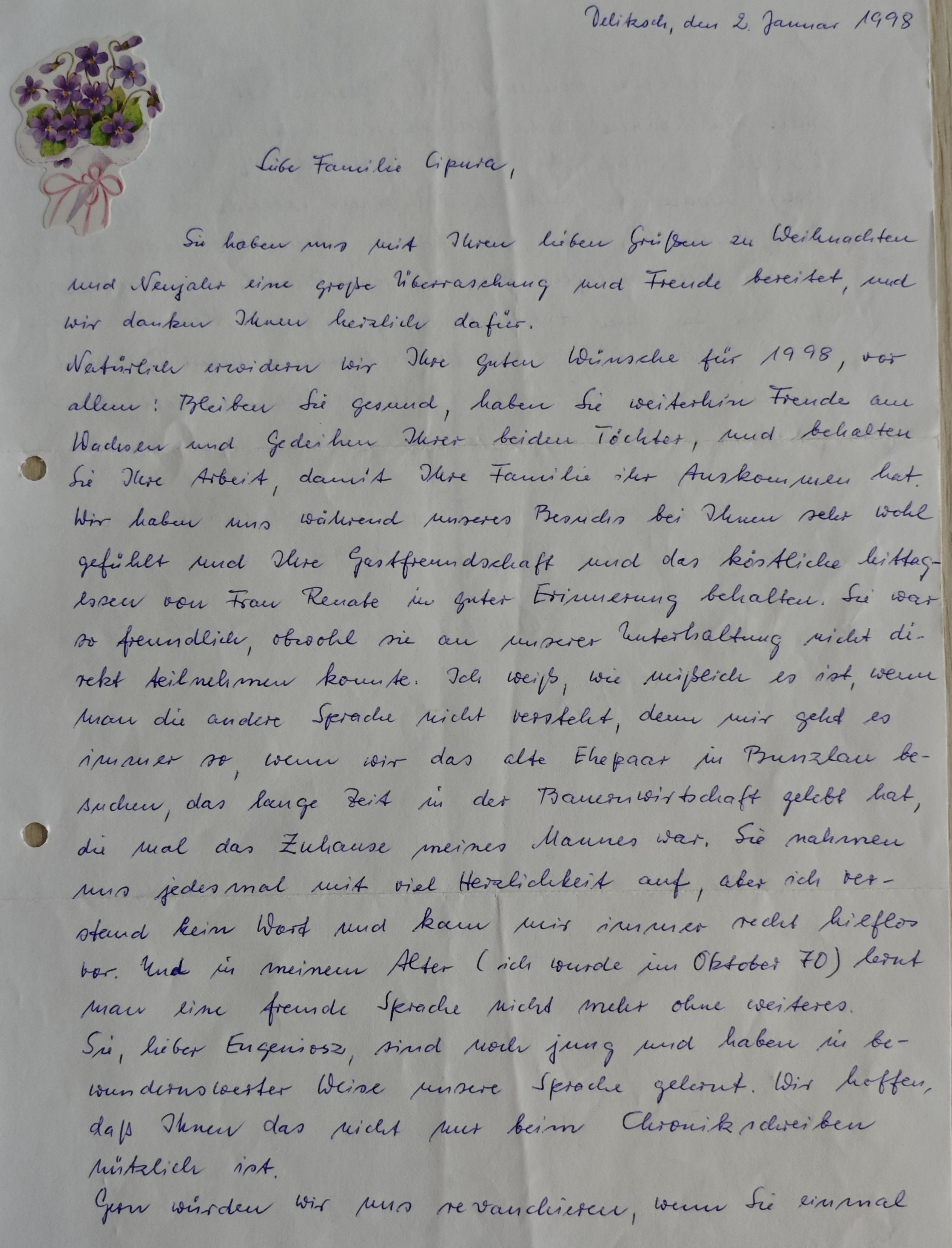 Podczas naszej wizyty u Was czuliśmy się bardzo dobrze i zachowaliśmy w dobrej pamięci Waszą gościnność oraz pyszny obiad Pani Renaty. Była tak miła, mimo że nie mogła brać bezpośredniego udziału w naszej rozmowie. Wiem, jak to niezręcznie, gdy nie rozumie się drugiego języka, bo mam tak samo, gdy odwiedzamy stare małżeństwo w Bolesławcu (Bunzlau), które przez długi czas mieszkało w gospodarstwie rolnym, będącym kiedyś domem mojego męża. Przyjmowali nas za każdym razem z wielką serdecznością, ale ja nie rozumiełam ani słowa i zawsze czułam się dość bezradna. A w moim wieku (w październiku skończyłam 70 lat) nie uczy się już tak łatwo obcego języka.