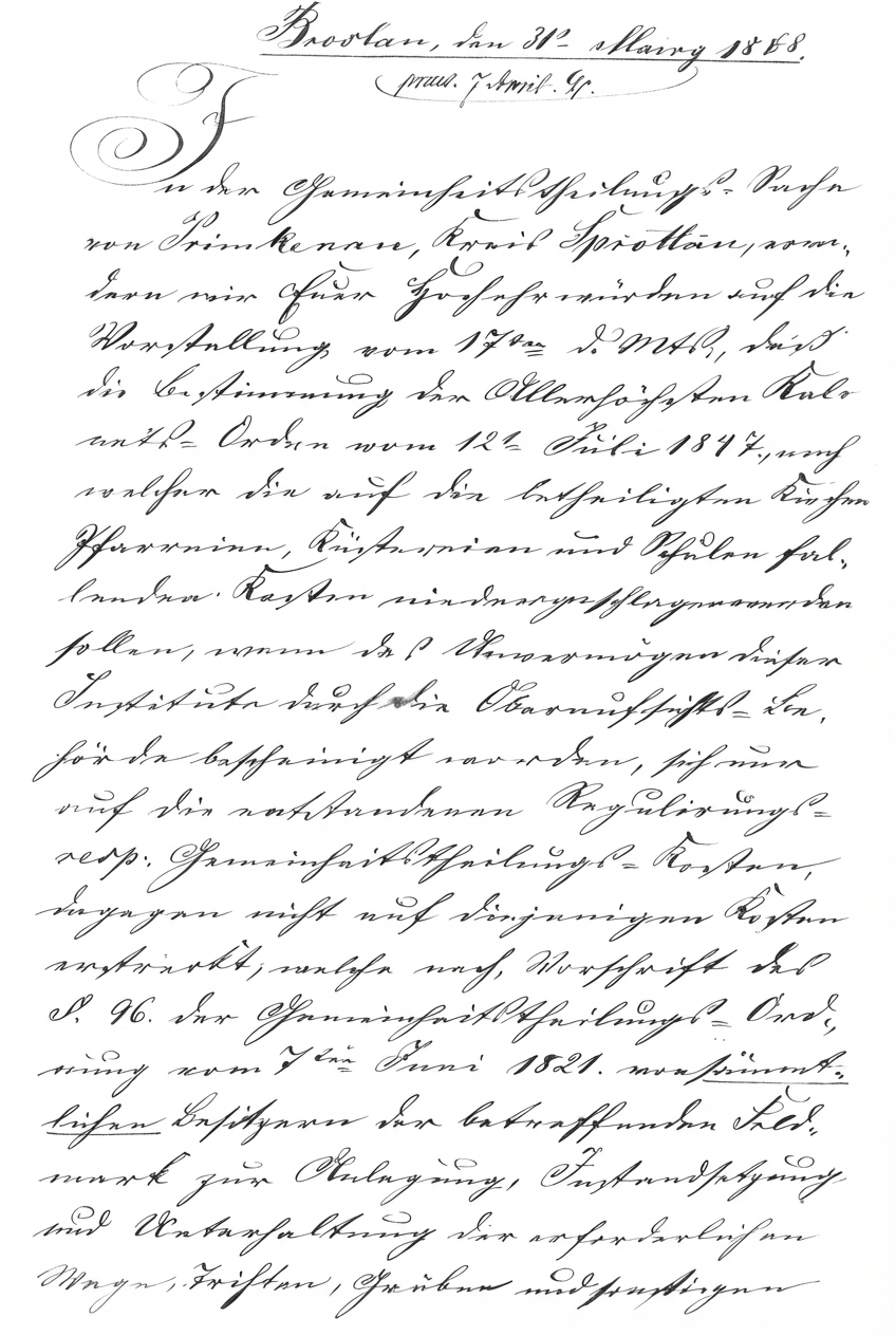 Prezentowany dokument to pismo urzędowe Królewskiej Komisji Generalnej dla Śląska we Wrocławiu, skierowane do księdza proboszcza Grollmusa z Przemkowa. Datowane na 31 marca 1868 roku pismo rzuca światło na realia pruskich reform rolnych w XIX wieku, a konkretnie na proces tzw. Gemeinheitstheilung, czyli zniesienia wspólnot gruntowych i scalania ziemi.