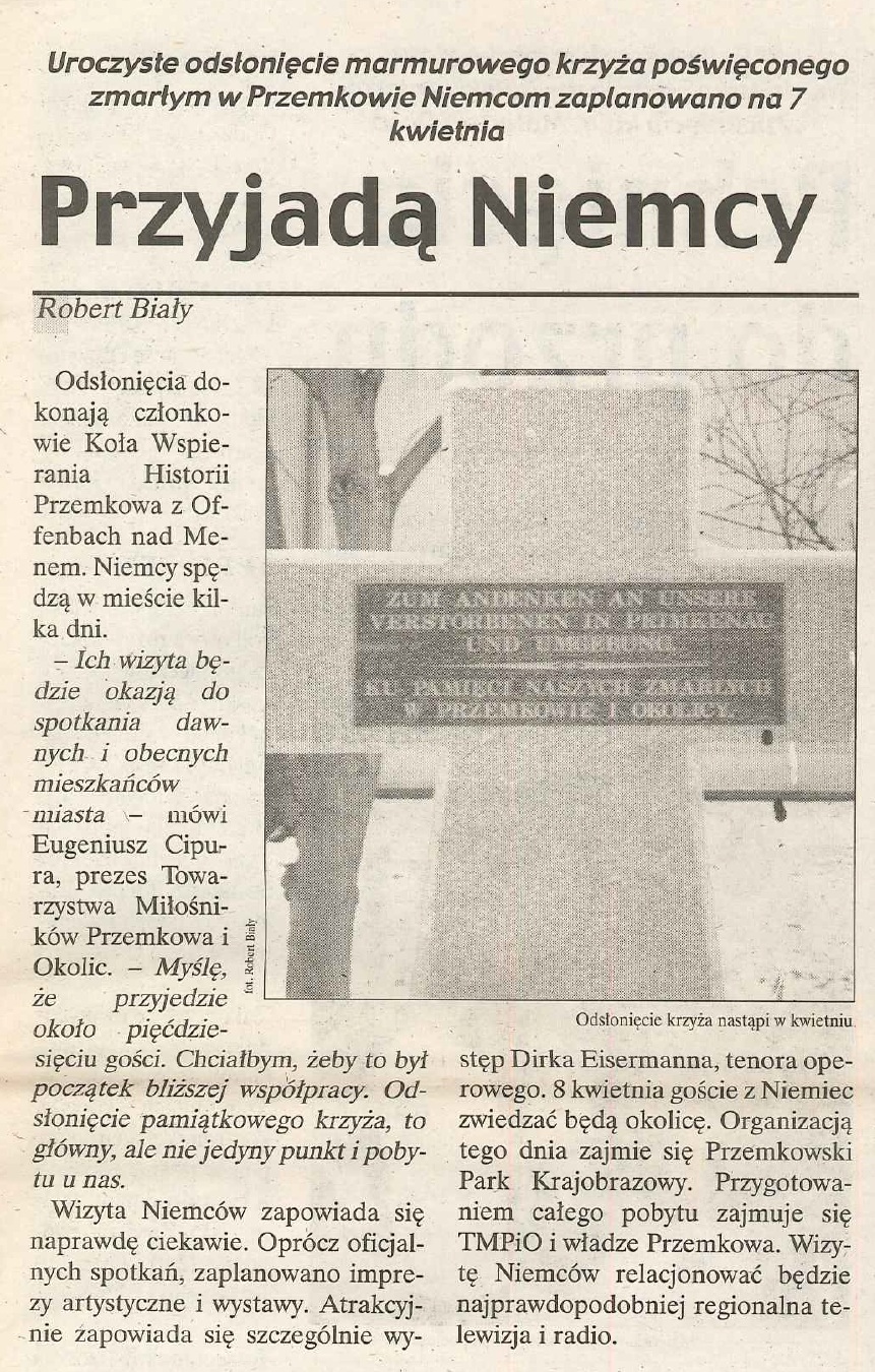 – Ich wizyta będzie okazją do spotkania dawnych i obecnych mieszkańców miasta – mówi Eugeniusz Cipura, prezes Towarzystwa Miłośników Przemkowa i Okolic. – Myślę, że przyjedzie około pięćdziesięciu gości. Chciałbym, żeby to był początek bliższej współpracy. Odsłonięcie pamiątkowego krzyża, to główny, ale nie jedyny punkt i pobytu u nas.