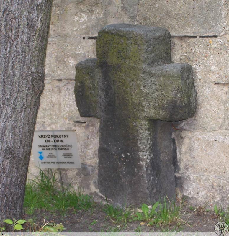 (Krzyż pokutny znajduje się) „na starym cmentarzu przykościelnym za apsydą kościoła. Znaleziony podczas wyburzania wschodniego muru cmentarza przykościelnego”.